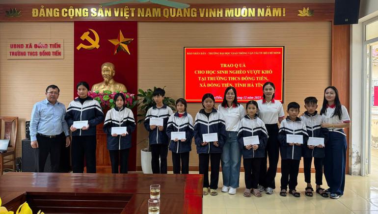 Đại diện lãnh đạo Cơ quan đại diện Báo Nhân Dân tại phía nam và Trường đại học Giao thông vận tải Thành phố Hồ Chí Minh trao tặng 20 suất quà, trị giá 20 triệu đồng cho các em học sinh trường Trung học cơ sở Đồng Tiến.