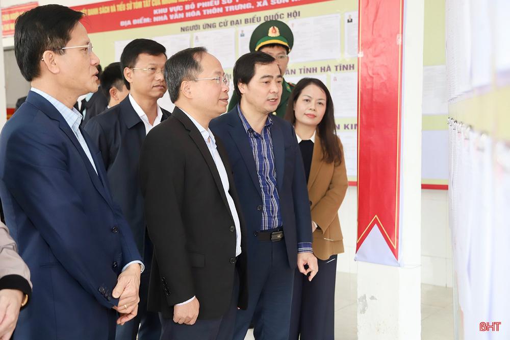 Đồng chí Nguyễn Duy Lâm - Ủy viên BCH Trung ương Đảng, Bí thư Tỉnh ủy, Trưởng ban Chỉ đạo bầu cử tỉnh và các thành viên đoàn kiểm tra công tác bầu cử tại khu vực bỏ phiếu số 1 (xã Sơn Kim 1).