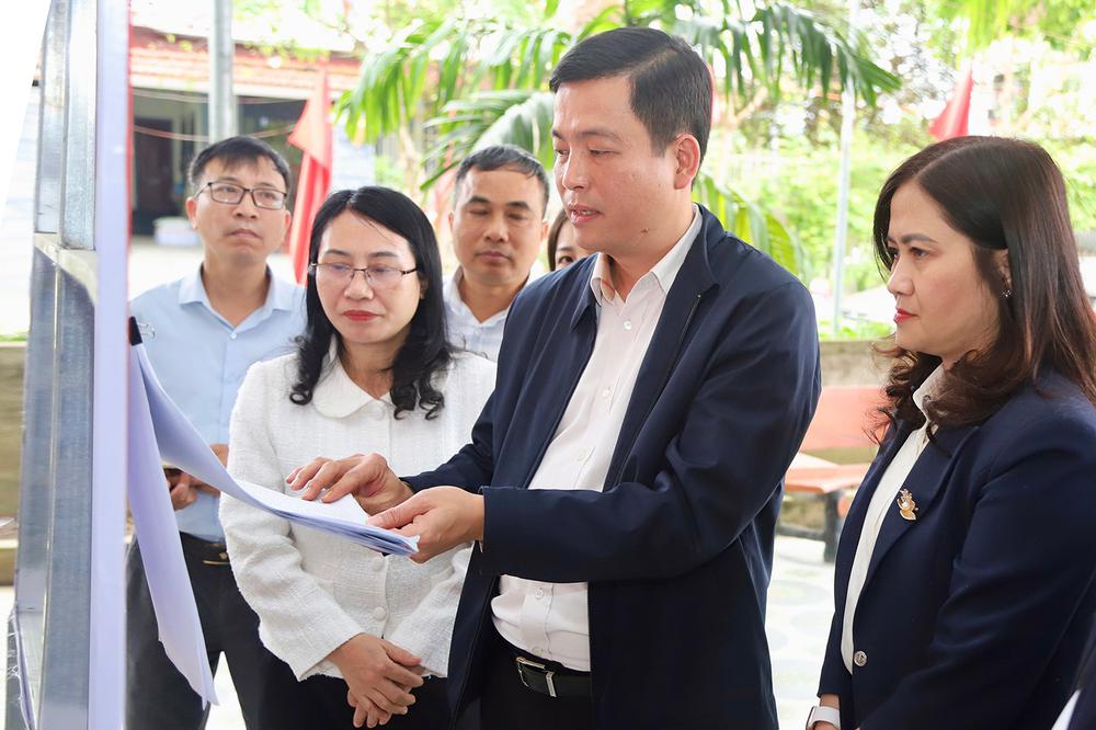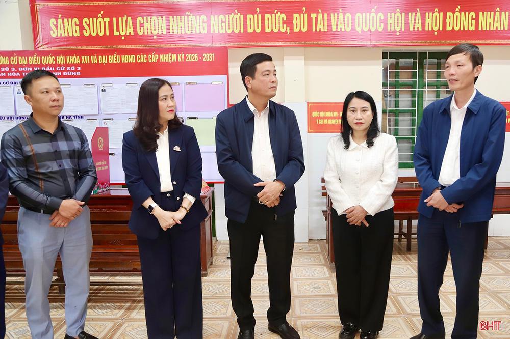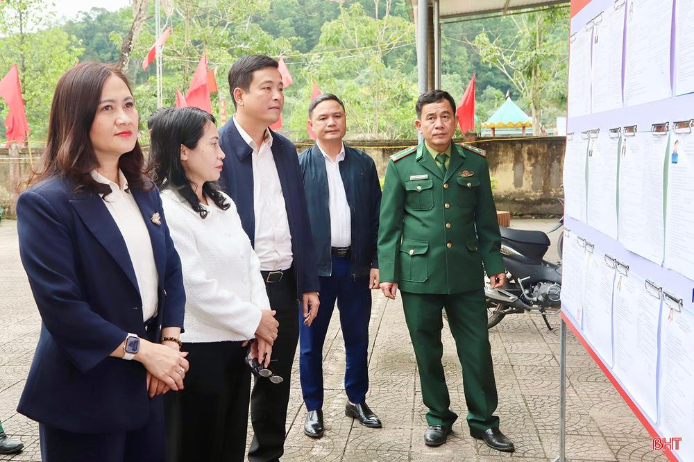 Qua kiểm tra thực tế các khu vực bỏ phiếu, đồng chí Nguyễn Thành Đồng và đoàn công tác ghi nhận tinh thần chủ động, nghiêm túc của các địa phương trong rà soát cử tri, chuẩn bị các điều kiện về cơ sở vật chất. Việc niêm yết danh sách người ứng cử được tiến hành khẩn trương, nghiêm túc, đúng luật định. (Trong ảnh: đoàn công tác kiểm tra khu vực bỏ phiếu số 5, xã Sơn Giang).