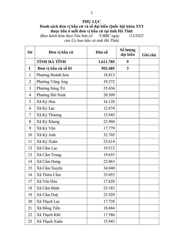 Thực hiện Văn bản số 100/VPHĐBCQG ngày 26/11/2025 của Văn phòng Hội đồng bầu cử Quốc gia về việc dự kiến số đơn vị bầu cử, số lượng đại biểu Quốc hội được bầu ở mỗi đơn vị bầu cử;