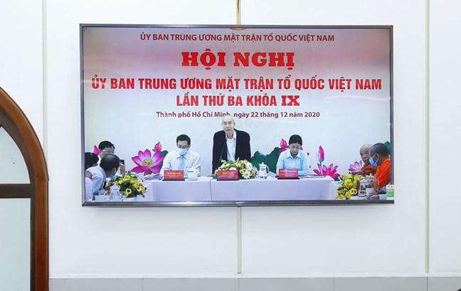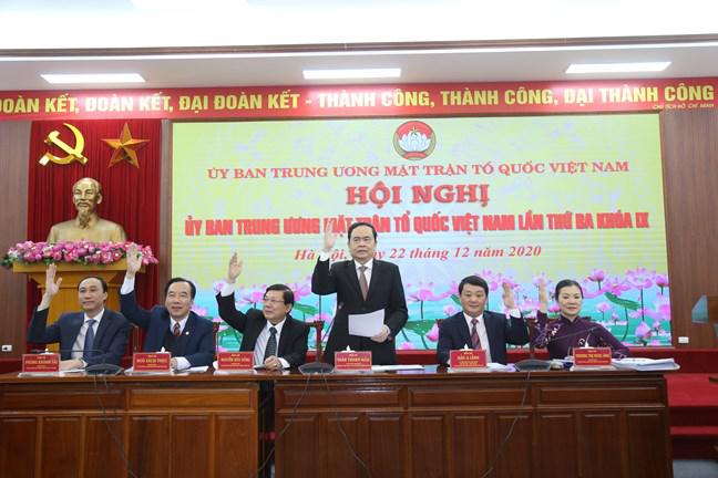 Ngày 22/12, UBTƯ MTTQ Việt Nam đã tổ chức Hội nghị Ủy ban Trung ương MTTQ Việt Nam lần thứ ba, khóa IX theo hình thức trực tuyến. Hội nghị nhằm thảo luận, cho ý kiến vào dự thảo Báo cáo kết quả công tác Mặt trận năm 2020, chương trình phối hợp và thống nhất hành động năm 2021; xin ý kiến vào các Tờ trình về nhân sự Ủy ban Trung ương, Đoàn Chủ tịch, tổ chức thành viên Ủy ban Trung ương MTTQ Việt Nam, một số dự thảo báo cáo chuyên đề và khen thưởng cho các tập thể, cá nhân có thành tích xuất sắc trong năm 2020.