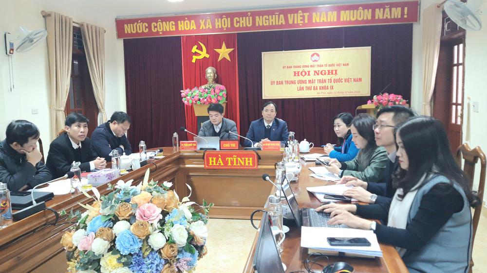 Tại điểm cầu tỉnh Hà Tĩnh có ông Hoàng Trung Dũng - Bí thư Tỉnh ủy, Chủ tịch Hội đồng nhân dân tỉnh, ông Trần Nhật Tân - Uỷ viên Ban Thường vụ Tỉnh ủy, Chủ tịch Ủy ban Mặt trận Tổ quốc Việt Nam tỉnh Hà Tĩnh, cùng các ông, bà trưởng, phó các ban chuyên môn cơ quan Ủy ban MTTQ Việt Nam tỉnh Hà Tĩnh.