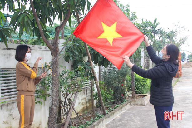 Người dân Hà Tĩnh đón ngày hội đại đoàn kết trong điều kiện phòng dịch nghiêm ngặt nhưng vẫn ấm áp nghĩa tình (Trong ảnh: Người dân thôn Đông Thắng - xã Mai Phụ - Lộc Hà treo cờ Tổ quốc chào mừng ngày hội).
