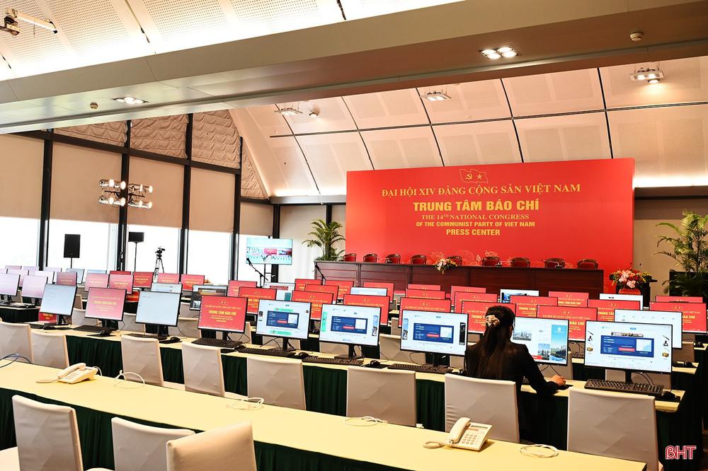 Trung tâm Báo chí Đại hội XIV với hệ thống máy tính đường truyền tốc độ cao phục vụ các cơ quan thông tấn trong và ngoài nước.