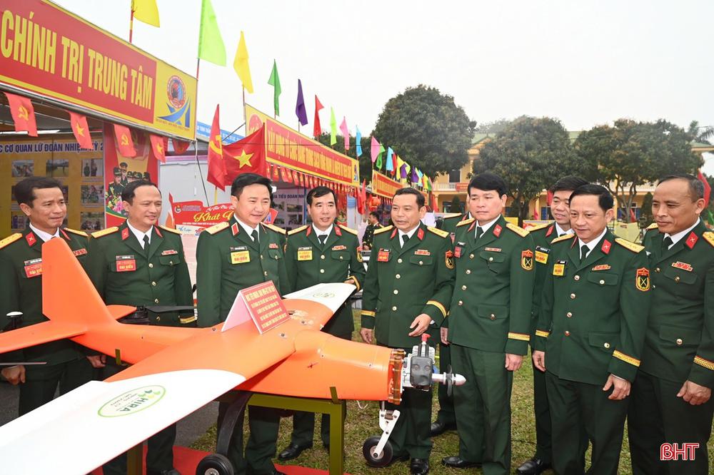 Thiếu tướng Đoàn Xuân Bường - Chính ủy Quân khu 4 (thứ 3 từ trái qua phải) tham quan trưng bày sáng kiến cải tiến mô hình huấn luyện của Lữ đoàn Phòng không 283.