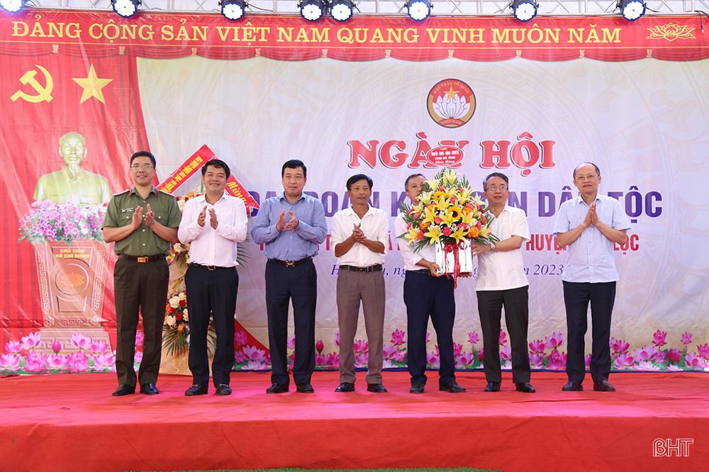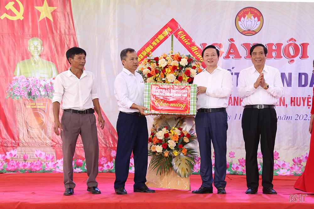 Lãnh đạo tỉnh tặng hoa chúc mừng thôn Hạ Triều nhân ngày hội đại đoàn kết.